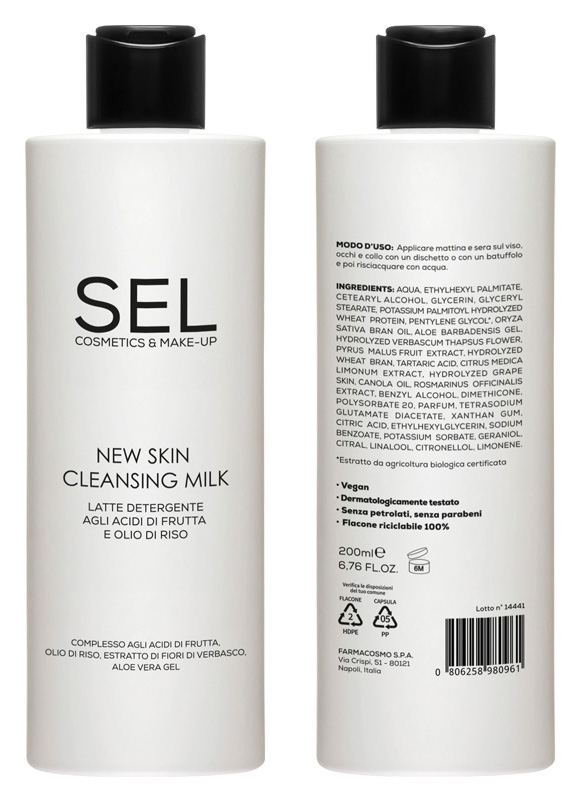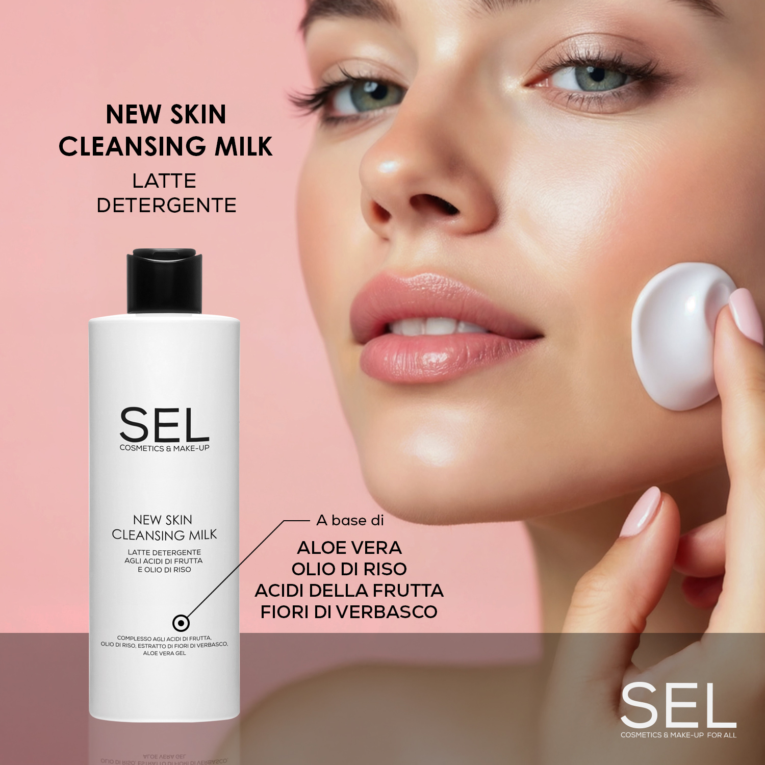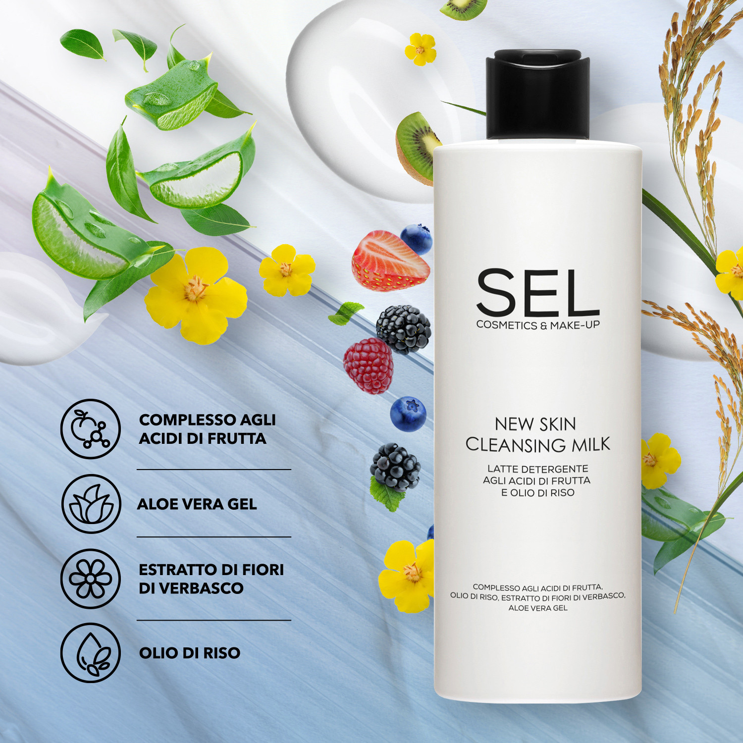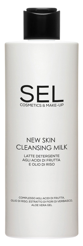 New Skin Cleansing Milk di SEL è un latte detergente indicato per tutti i tipi di pelle e formulato con un mix di estratti naturali in grado di esfoliare delicatamente la pelle del viso e di nutrirla con estrema dolcezza. Questo latte morbido e cremoso è ispirato alla biodiversità ambientale italiana e viene prodotto con mele del Trentino, bucce d'uva biologiche dell'Emilia, limoni di Sicilia e crusca di grano biologica della valle del Po. Insieme a questo mix di ingredienti, sono combinati, in forma sinergica: gel di Aloe Vera, dall'azione nutriente e riparatrice; Olio di Riso, dalle proprietà antiossidanti, lenitive e decongestionanti; estratto di Fiori di verbasco, principio attivo basato sulla fotoluminescenza delle piante e ideale per donare una sorprendente luminosità alla pelle.