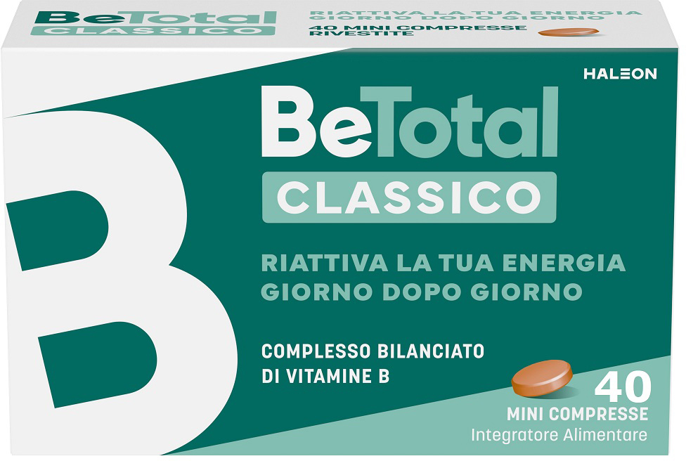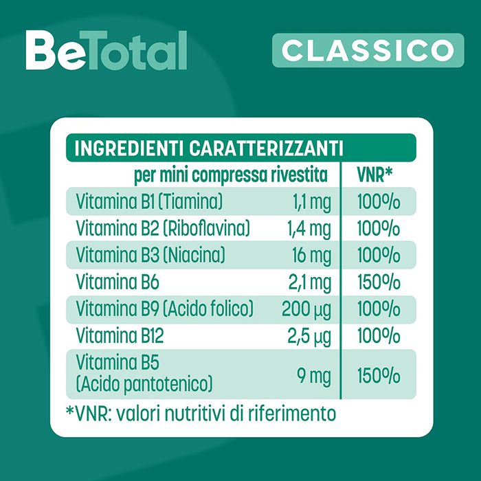 BE-TOTAL è un Integratore Alimentare di Vitamine del gruppo B che contribuiscono al rilascio di energia dal cibo. Le Vitamine B sono coinvolte in numerose funzioni dell'organismo, tra le quali le reazioni biochimiche che trasformano carboidrati, grassi e proteine alimentari in energia. I componenti di BE-TOTAL contribuiscono quindi ad un sano metabolismo energetico.