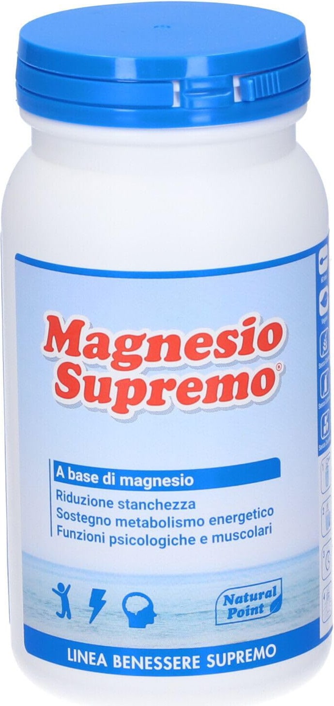 Magnesio Supremo, formula originale di Natural Point, è una miscela esclusiva sviluppata in una linea di produzione dedicata, costituita da acido citrico di origine vegetale e da magnesio carbonato di origine marina. La miscela in acqua si trasforma in una soluzione ad alto contenuto di magnesio citrato, sale organico altamente solubile col elevata velocità di assorbimento.