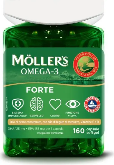 Omega-3 Forte di Moller's è un integratore alimentare di di olio di pesce omega-3 lisce e facili da deglutire con vitamine essenziali A, D ed E. DHA contribuisce alla normale funzione cerebrale e alla normale capacità visiva. La vitamina D contribuisce al normale fuzionamento del sistema immunitario e al mantenimento della salute di ossa e denti.