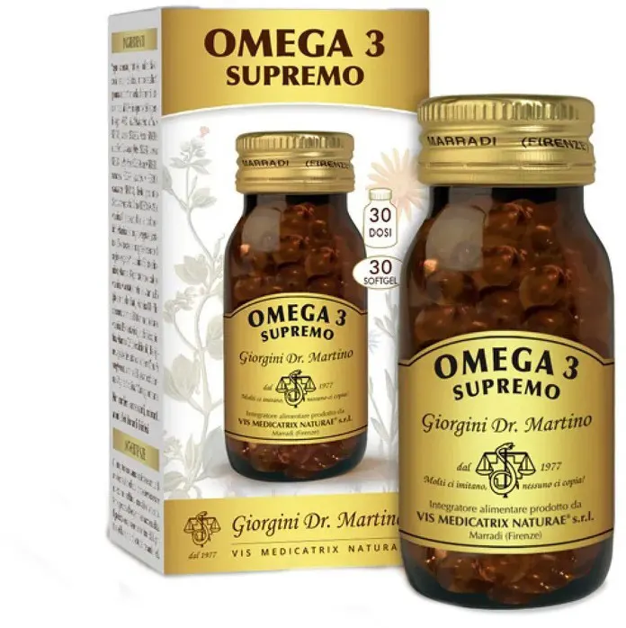 Omega 3 Supremo del Dr. Giorgini è un integratore alimentare ricco di acidi grassi polinsaturi essenziali (omega 3). Il DHA favorisce la normale funzione cerebrale, contribuisce al mantenimento della capacità visiva e, insieme all'EPA, sostiene la normale funzione cardiaca; inoltre, DHA ed EPA aiutano a mantenere i normali livelli di trigliceridi nel sangue.
