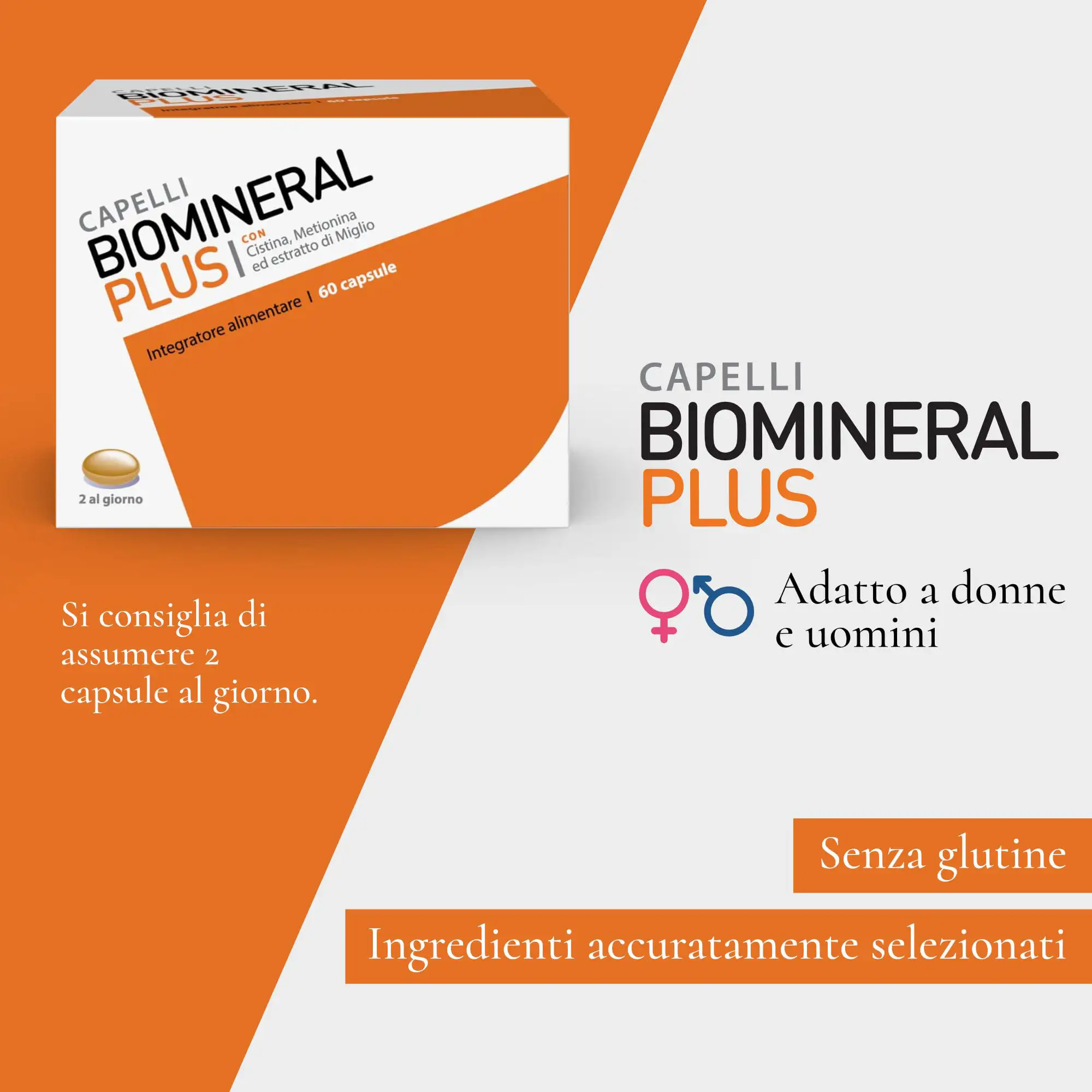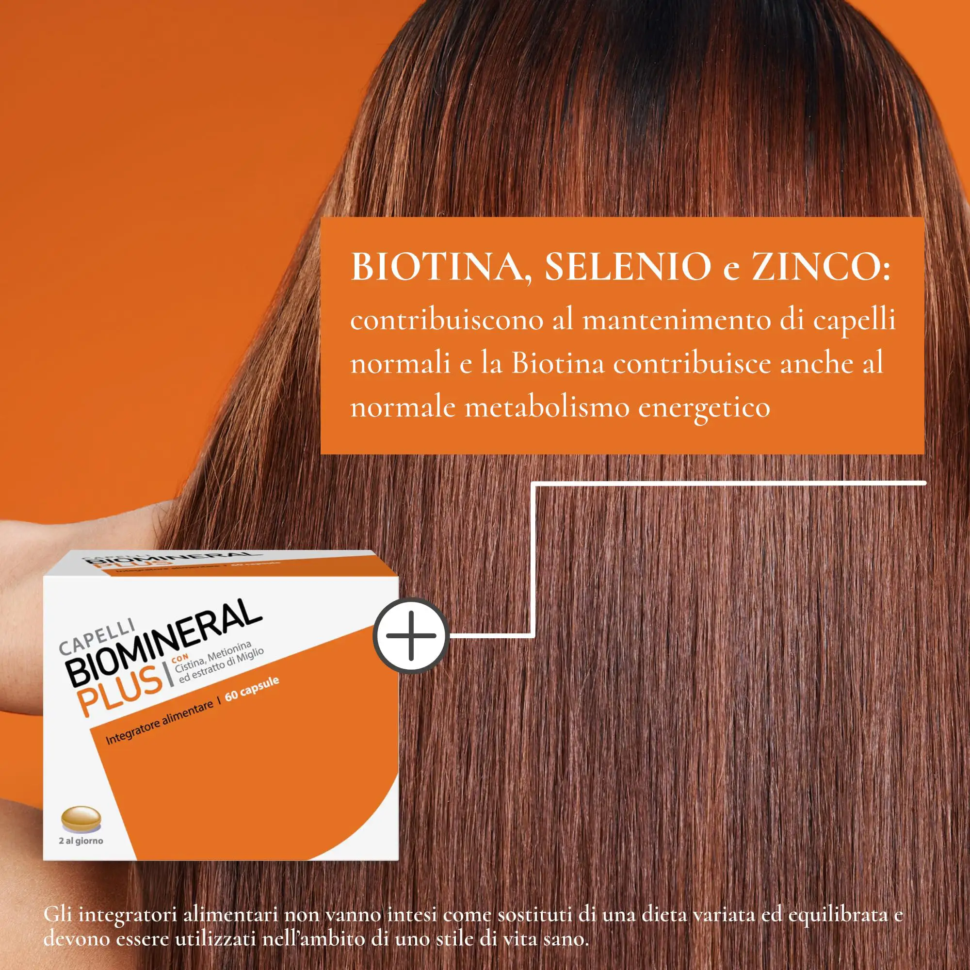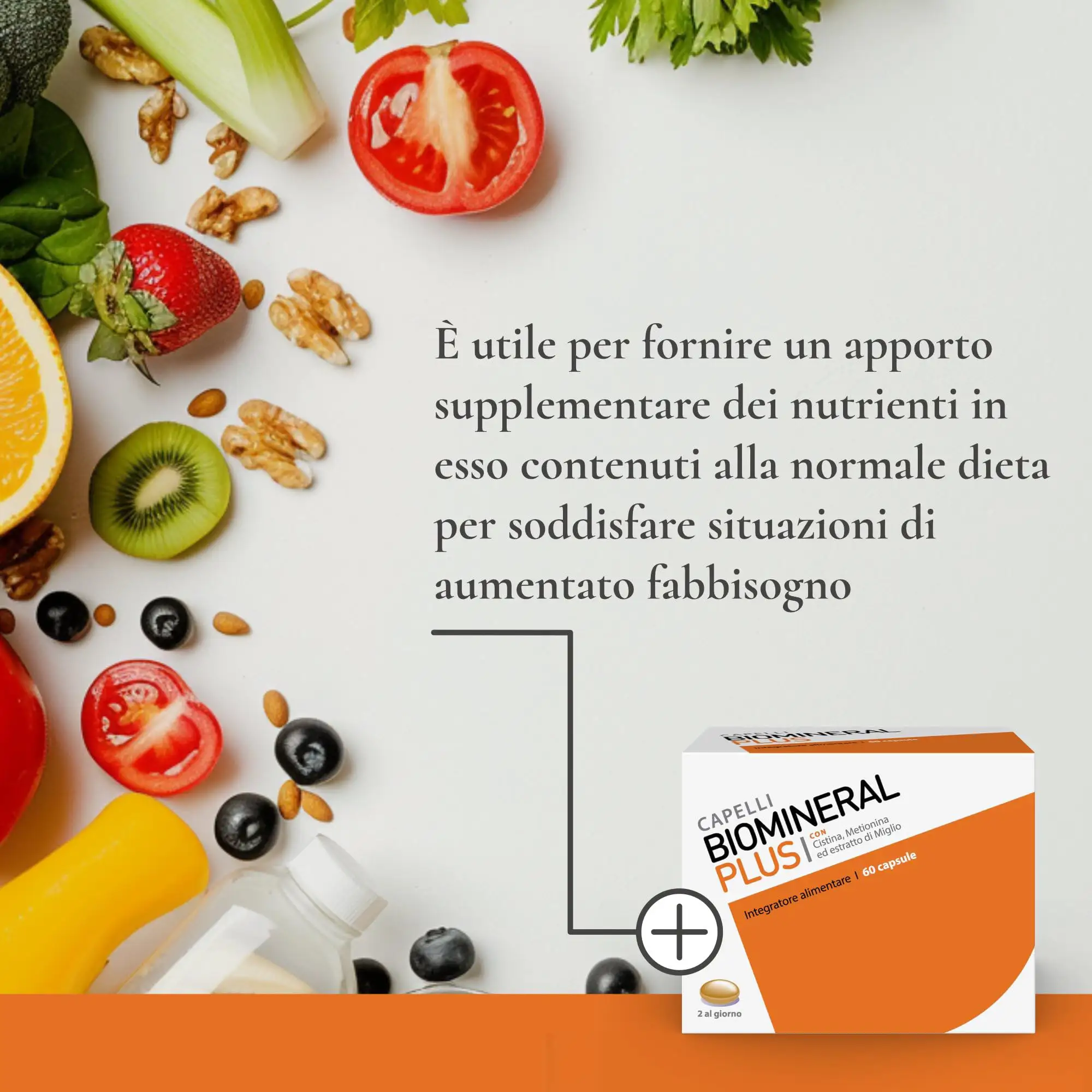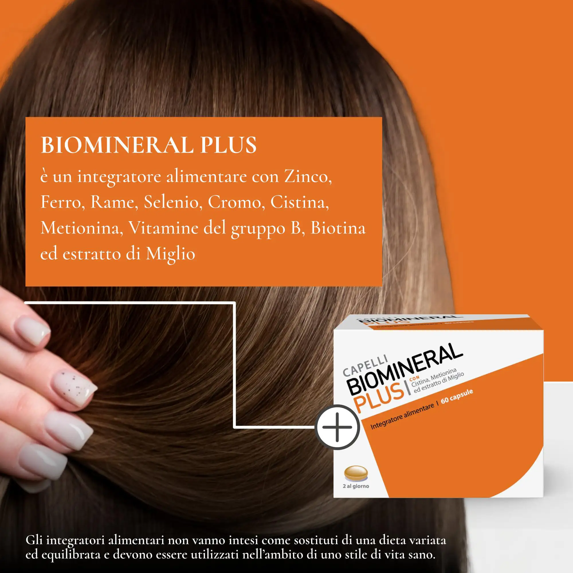 Biomineral Plus è usato anche come integratore anticaduta per capelli, poichè aiuta a ripristinare il ciclo di vita dei capelli; non è calorico e quindi può essere usato anche da persone che seguono regimi alimentari particolari e ipocalorici.