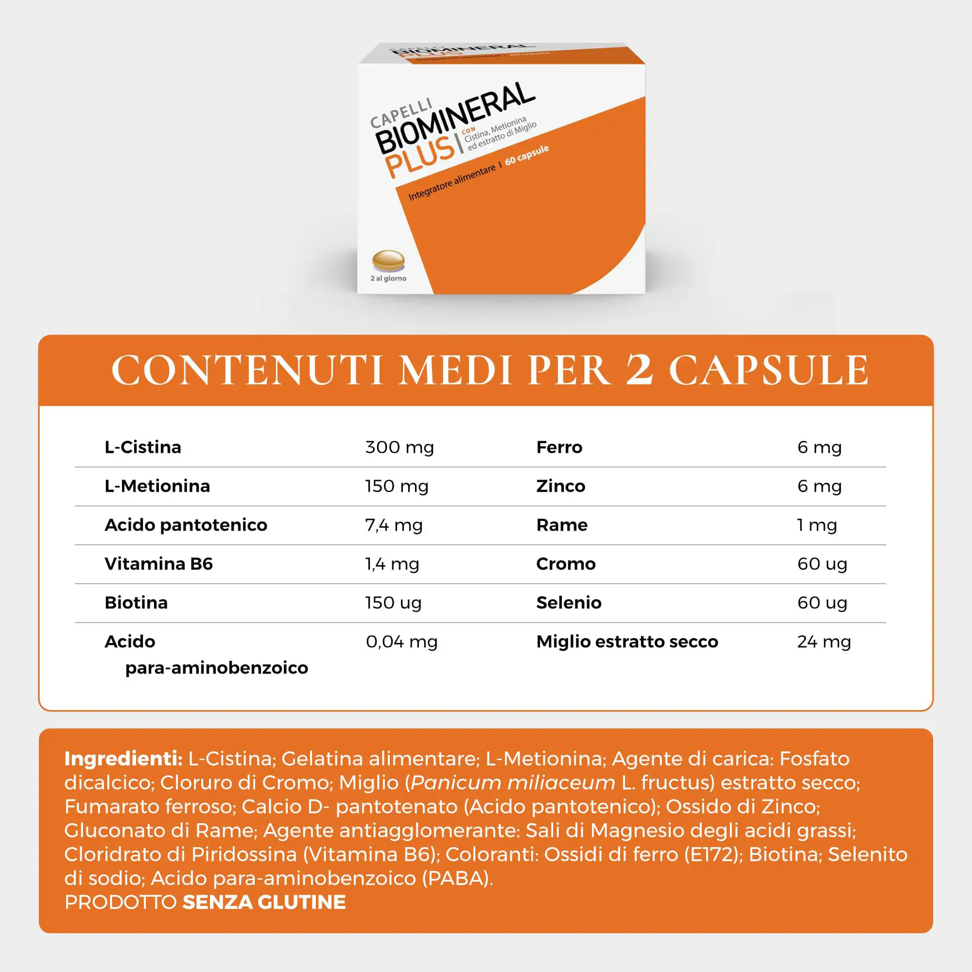 L-Cistina; L-Metionina; gelatina; estratto di miglio polvere; acido P-Aminobenzoico (PABA); ferro fumarato; antiagglomerante: biossido di silicio; calcio pantotenato; zinco ossido; rame gluconato; cromo solfato; biotina; sodio selenio.