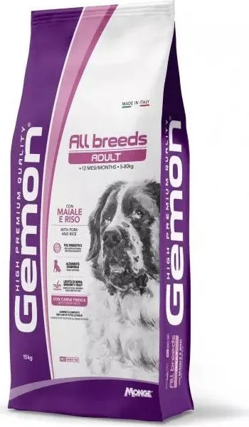 Gemon All Breeds adult di Monge è un alimento completo per cani adulti di tutte le taglie. La formulazione è caratterizzata da ingredienti di qualità come il maiale, fonte di nutrienti essenziali, e il riso, fonte di carboidrati, resi altamente digeribili mediante il processo di estrusione. Un'alimentazione bilanciata con prebiotici, quali i frutto-oligosaccaridi (FOS) e polpa di barbabietola, fonte di fibre insolubili, per la regolarità del tratto intestinale. Contiene carne fresca per un'appetibilità ottimale e con glucosamina e solfato di condroitina per il supporto delle articolazioni e delle ossa. Formulata inoltre con lievito di birra per un mantello folto e morbido, senza coloranti e conservanti artificiali aggiunti.